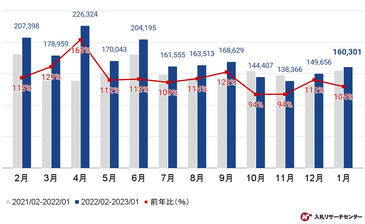 2023年1月の公示案件数の総計は160,301件で、前年比104%となりました。