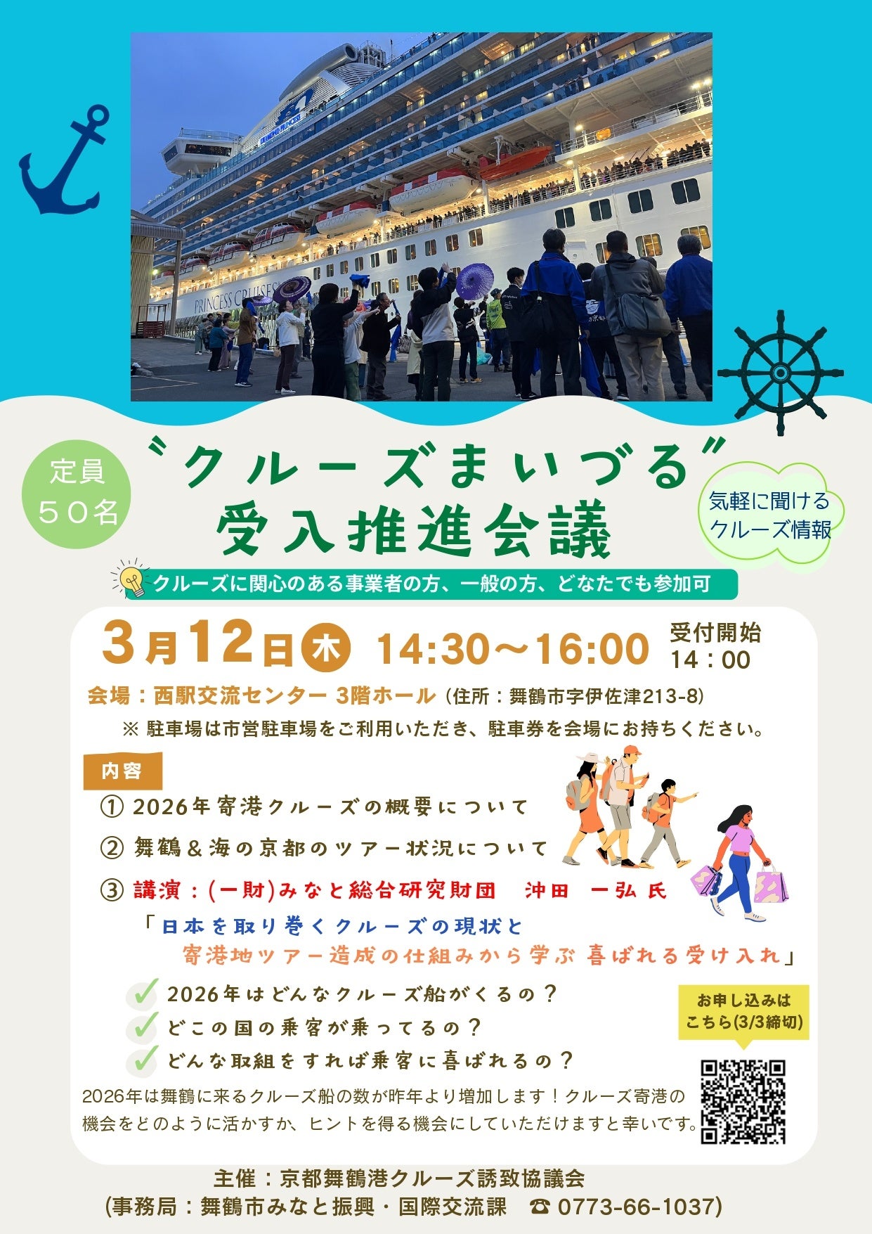 京都舞鶴港クルーズ誘致協議会は、令和8年3月12日(木)に西駅交流センターにて「クルーズまいづる」受入推進会議を開催します。2026年のクルーズ船寄港増加を見据え、受入体制の強化や地域活性化のヒントを探ります。