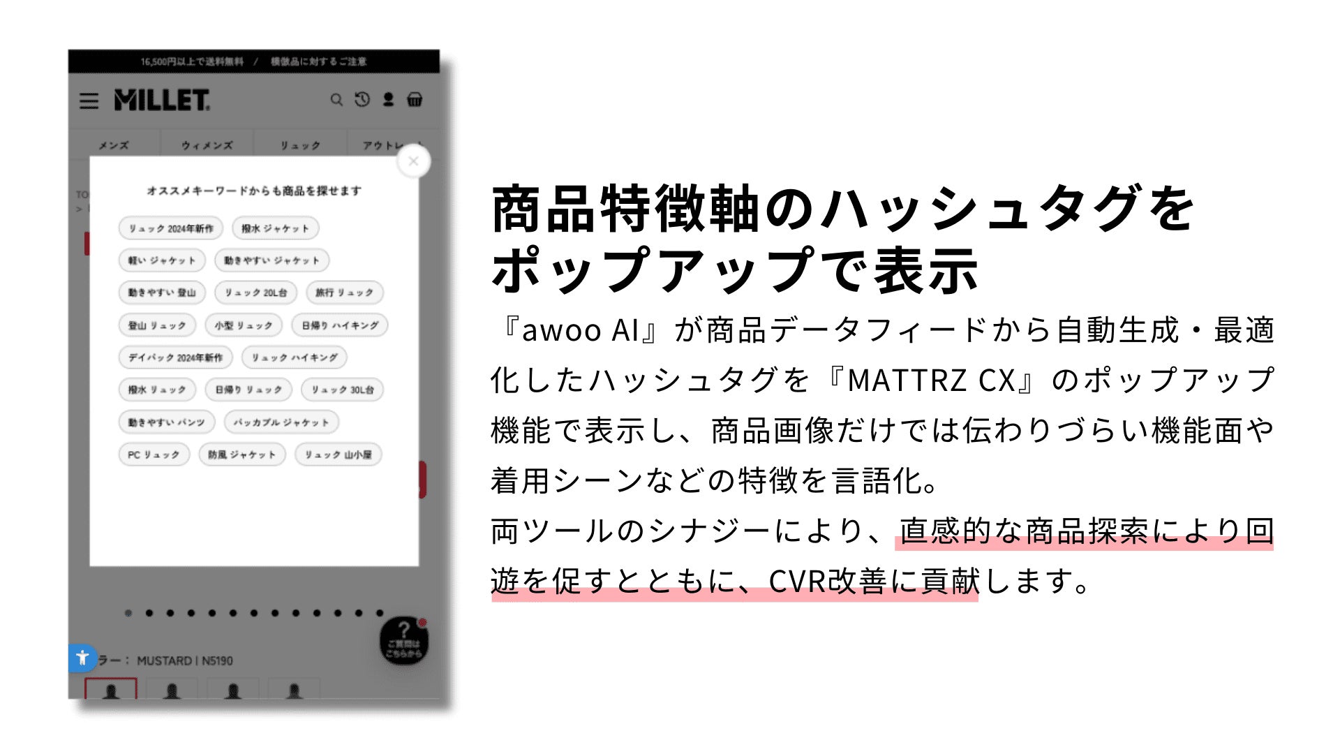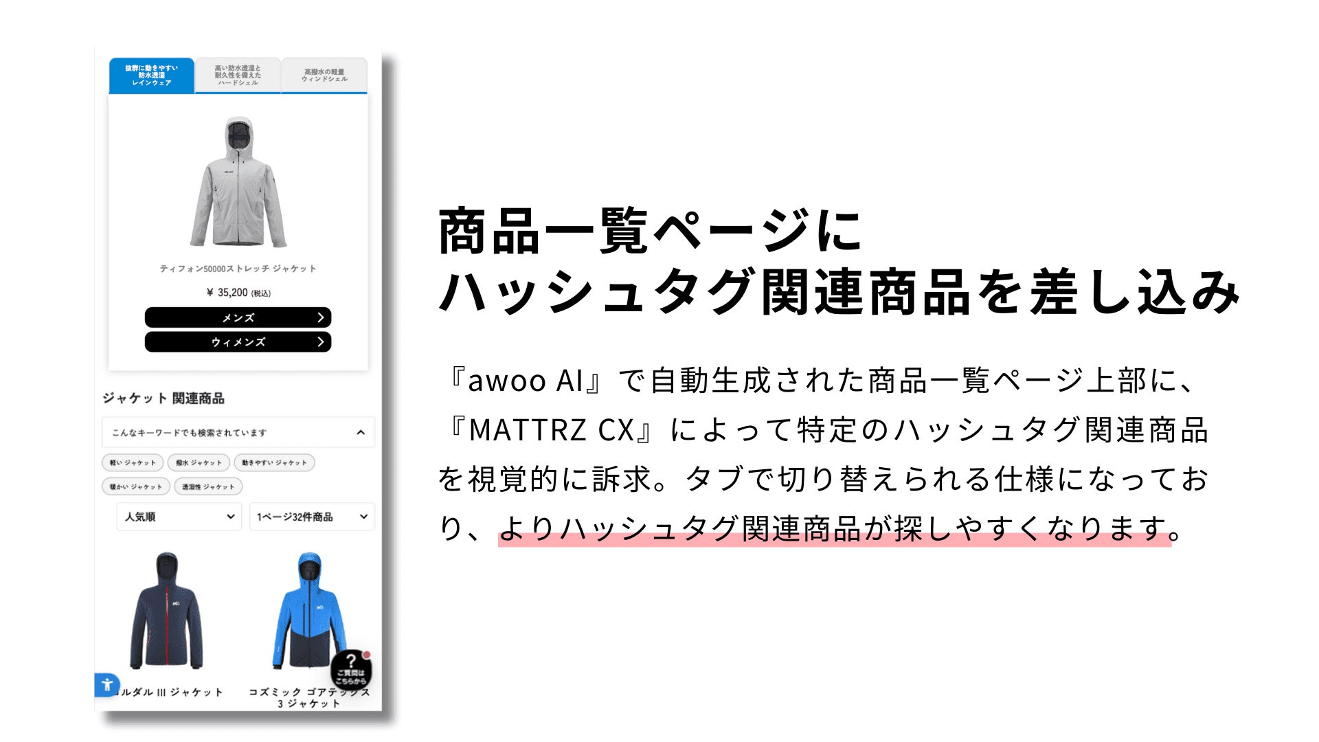 同社はECプラットフォーム「futureshop」を使用した公式オンラインストアにて、すべてのお客様が感覚的に求める商品に辿り着くことができる商品検索体験を目指し、商品情報からAIが自動でハッシュタグを生成・最適化を行う「awoo AI(アウーエーアイ)」と、Web接客・コンテンツ差し込みなど、多様な機能でコミュニケーション最適化・離脱防止を行う「MATTRZ CX(マターズ シーエックス)」を連携した新たな施策を実施しました。