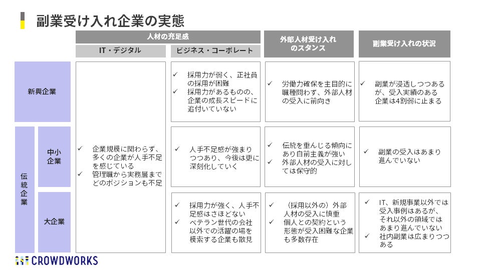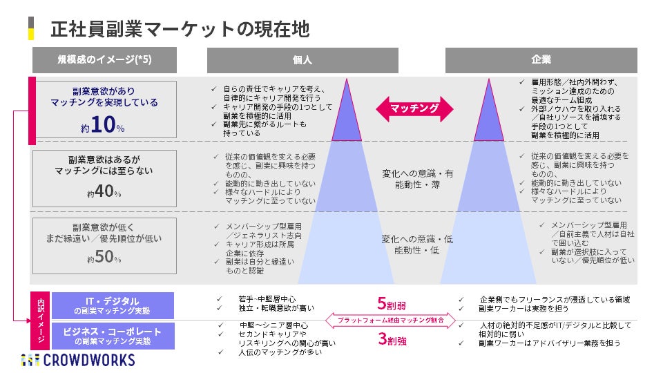 - 企業側の背景として、大企業を中心に人材を自社で囲い込む採用スタイルが根強いことや、副業ワーカーに業務発注を行う際の要件定義やジョブディスクリプションの難しさなどが一定ある