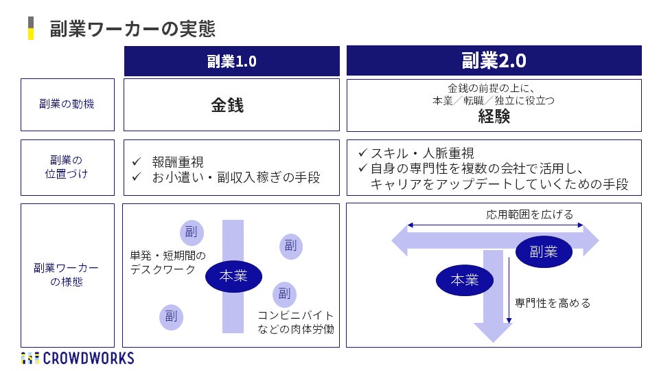 - ワーカーにとっての「副業」は、従来の「隙間時間でのお小遣い稼ぎ」(副業1.0)だけではなく、「キャリアを自らアップデートしていくための手段」(副業2.0)へと捉え方が拡大