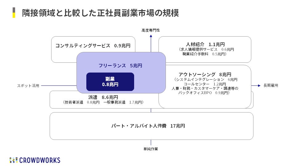 - 一方で副業は、「スポット活用」「高度専門性」などコンサルティングサービスや派遣・BPO市場らと接近してきており、拡大の余地が十分にある