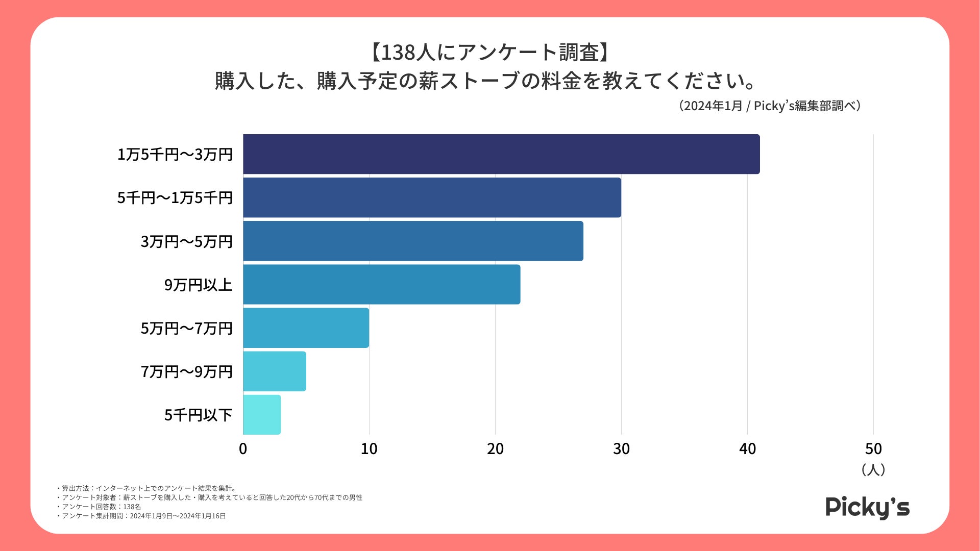 価格と性能のバランスが取れたコスパのいい薪ストーブを選ぶ方が多い一方で、3万円以上の本格的なスペックを持つ商品を求めるこだわり派の方も半数以上いることがわかりました。