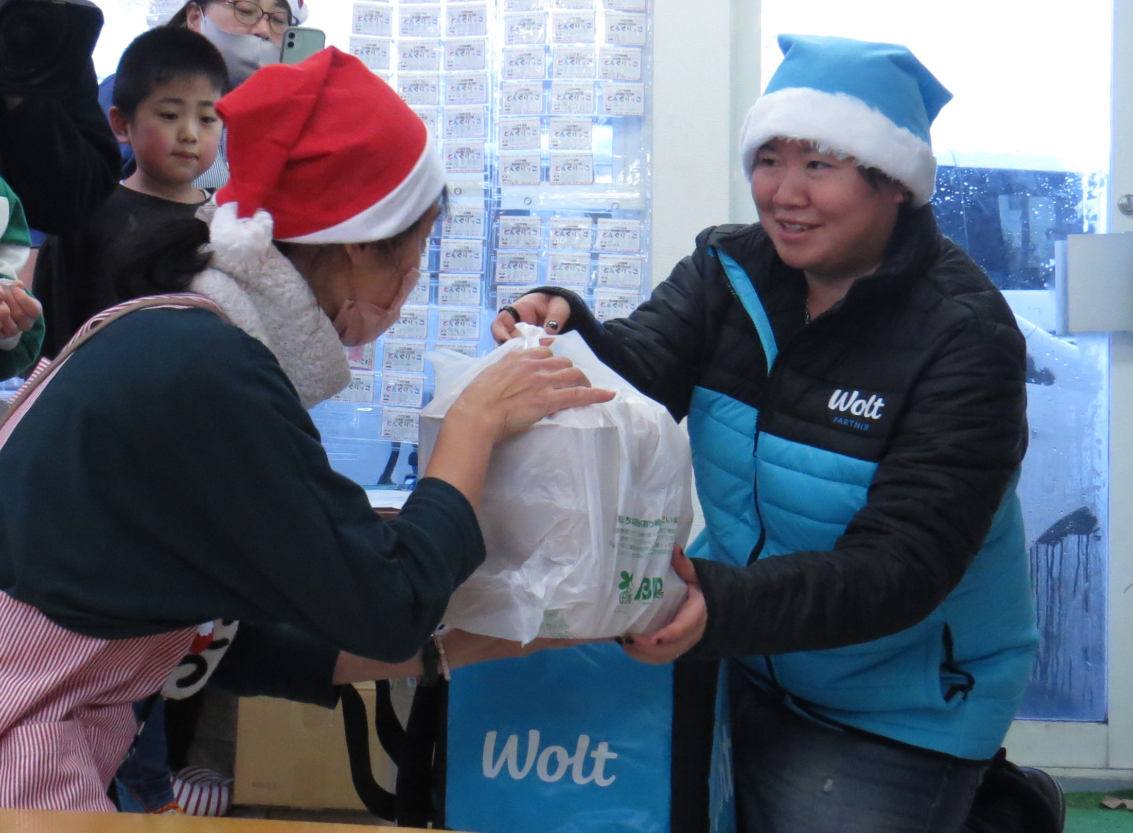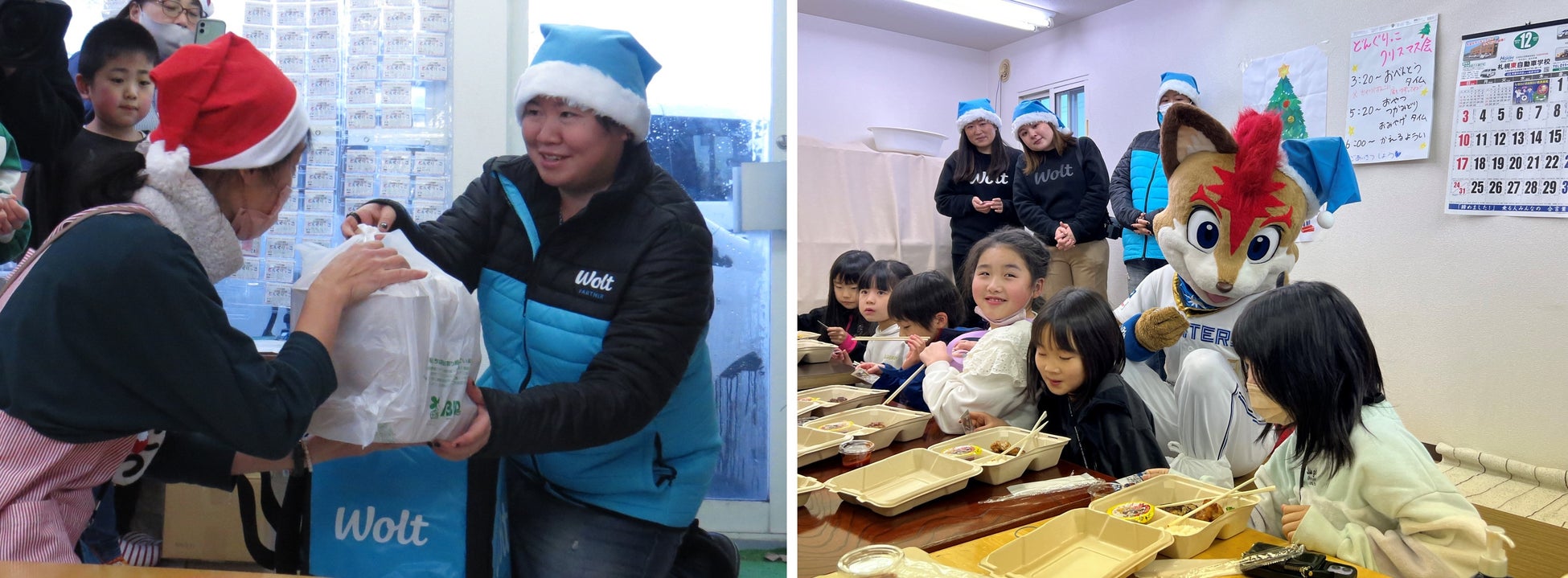 2023年12月20日、コーポレートカラーである「ブルー」にちなんだ「ブルーサンタ」に扮したWolt配達パートナーが、札幌市内の子ども食堂「ふれあいひろば どんぐりっこ」「こども食堂ぐれ~す」に、ホリデープレゼントとして、お弁当やドリンクなどを無償でお届けしました。また、Wolt Japanがオフィシャルスポンサーとして活動を応援する北海道日本ハムファイターズのマスコットキャラクター「フレップ」もサプライズゲストとして登場し、プロジェクトを盛り上げました。