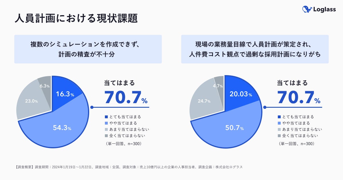 結果として、「複数のシミュレーションを作成できず、計画の精査が不十分」「現場の業務量目線で人員計画が策定され、人件費コスト観点で過剰な採用計画になりがち」といった課題が発生しています。(当社が人事担当者300名を対象に実施した調査より)