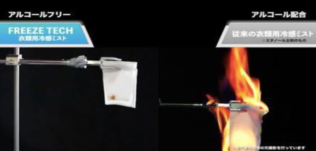フリーズテック衣類用冷感ミストと、自社従来のエタノール配合の冷感ミストを噴霧して、引火の様子を確認。アルコールフリー(※3)のフリーズテック衣類用冷感ミストには引火がみられず、エタノール配合の冷感ミストは大きな炎に包まれた。