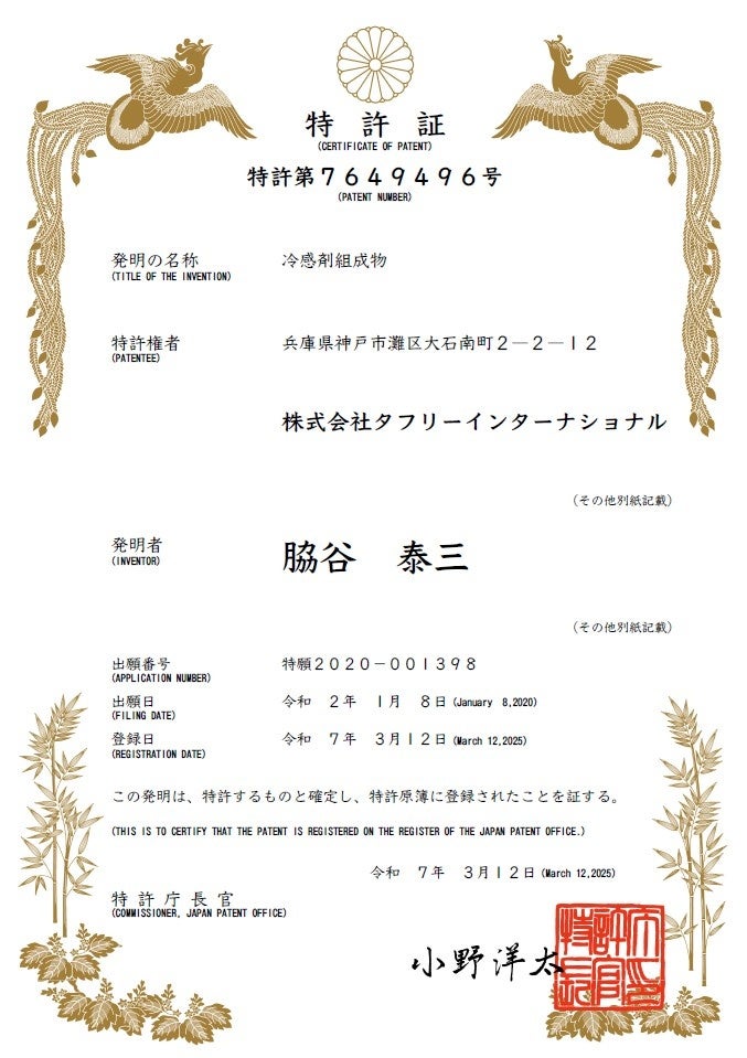 本商品は株式会社タフリーインターナショナルとの共同開発により発売しており、本技術は世界初の技術として特許を取得いたしました。