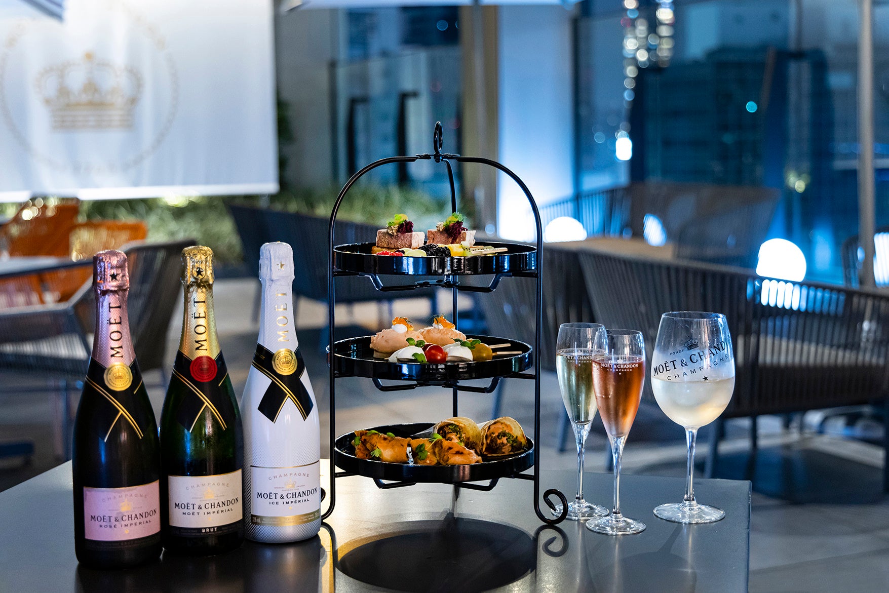 お食事後は、ルーフトップバー「PLATFORM9」にて、世界的に有名なシャンパンメゾン「モエ・エ・シャンドン」と初コラボレーションで贈る「シャンパンガーデン feat.モエ・エ・シャンドン」へ。(木金土開催) 3種類のモエ・エ・シャンドンのフリーフローに加え、フードペアリングにはイクラの王様と称される「サーモンキャビア」を添えた自家製リエットや、シャンパンに浮かべて楽しむフルーツスティックなど、美しいシャンパンとともに楽しむ、プルマン東京田町ならではのインスピレーションが豊かに広がります。