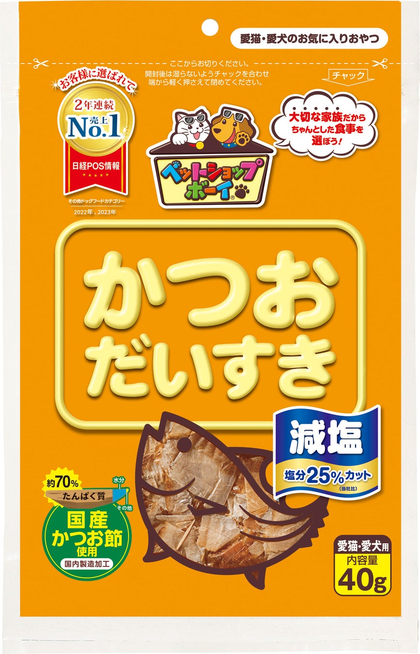「減塩かつおだいすき40g」は、ペット用おやつとして販売しているマルトモ「だいすきシリーズ」の一つで、大切な家族の一員であるねこちゃん・わんちゃんに安心・安全な食事を提供したいという想いで作られた商品です。近年、ねこちゃん・わんちゃん達も平均寿命が延び健康寿命が課題といわれている中、マルトモはねこちゃん・わんちゃん達の食生活改善のためにいち早く減塩商品提案に取り組んでおり、この商品は、当社一般品に比べ塩分を約25%カットした、健康に配慮した商品となっております。なお、「その他削り節カテゴリー」においてはマルトモ「だしの力100g(※)」も5年連続売上No.1 を獲得しました。※現在は終売し、「だしの力80g」を発売中