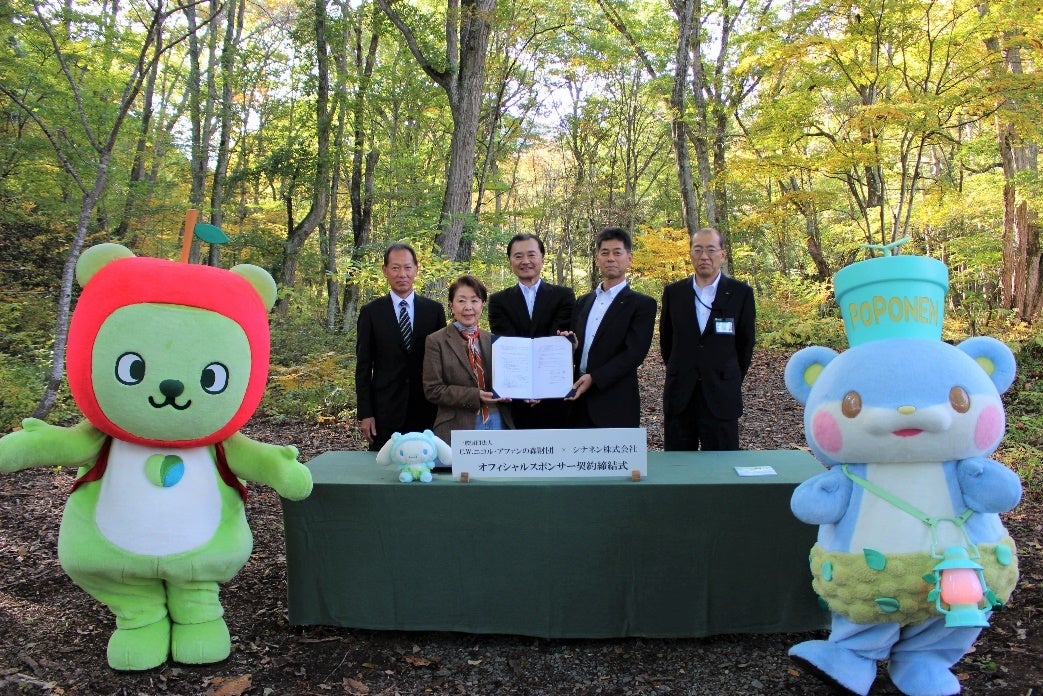 2023年10月24日(火)には、アファンの森財団理事長 森田 いづみ氏、シナネン代表取締役社長 清水 直樹に加え、長野県林務部長 須藤 俊一氏が立会人として参加し、アファンの森で調印式を行いました。さらに、株式会社サンリオが手掛けたキャラクターであり、クリーンなエネルギー広めるために未来からやってきたあかりの森の番人「ポポネン」、長野県PRキャラクター「アルクマ」も応援に駆けつけました。