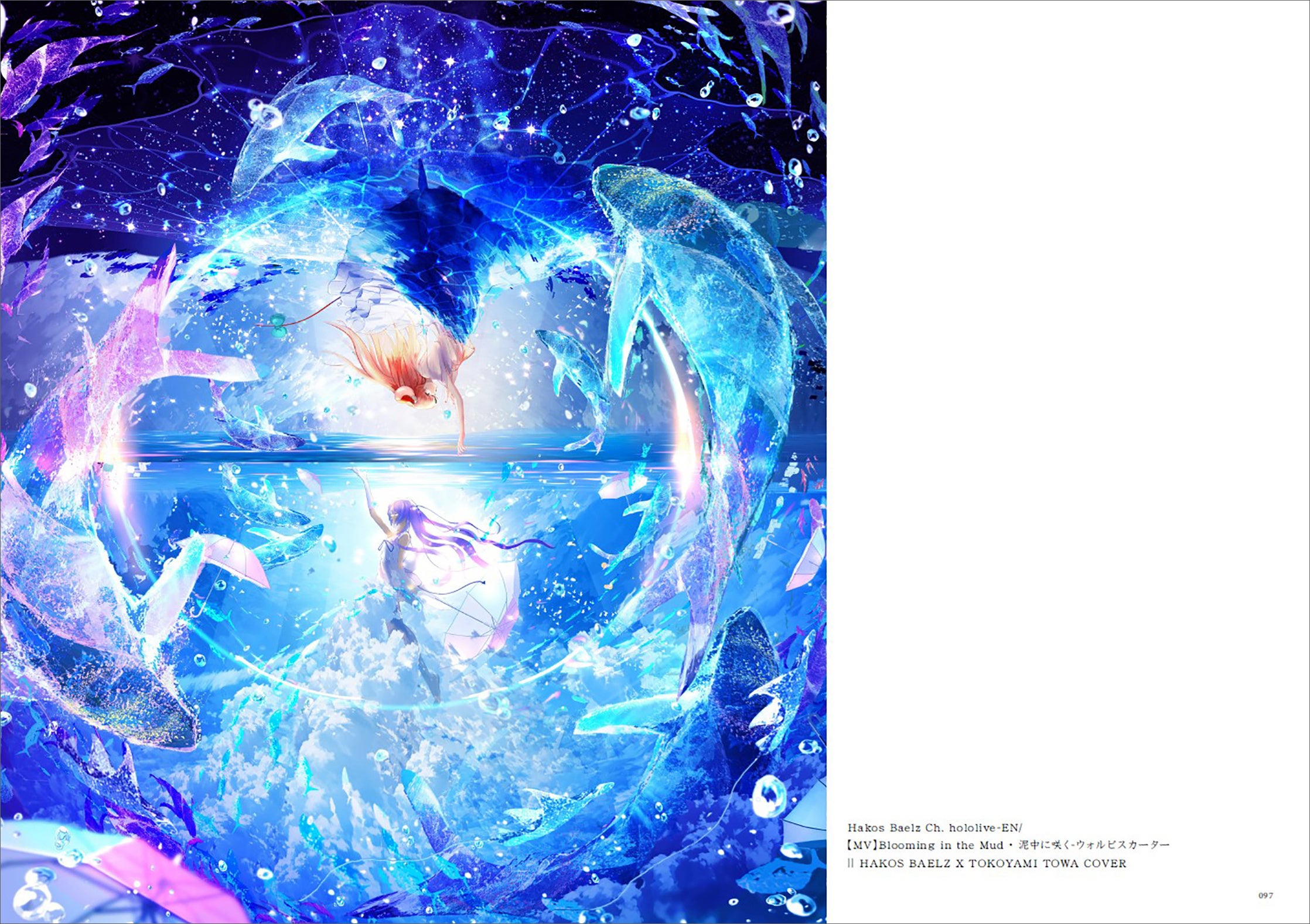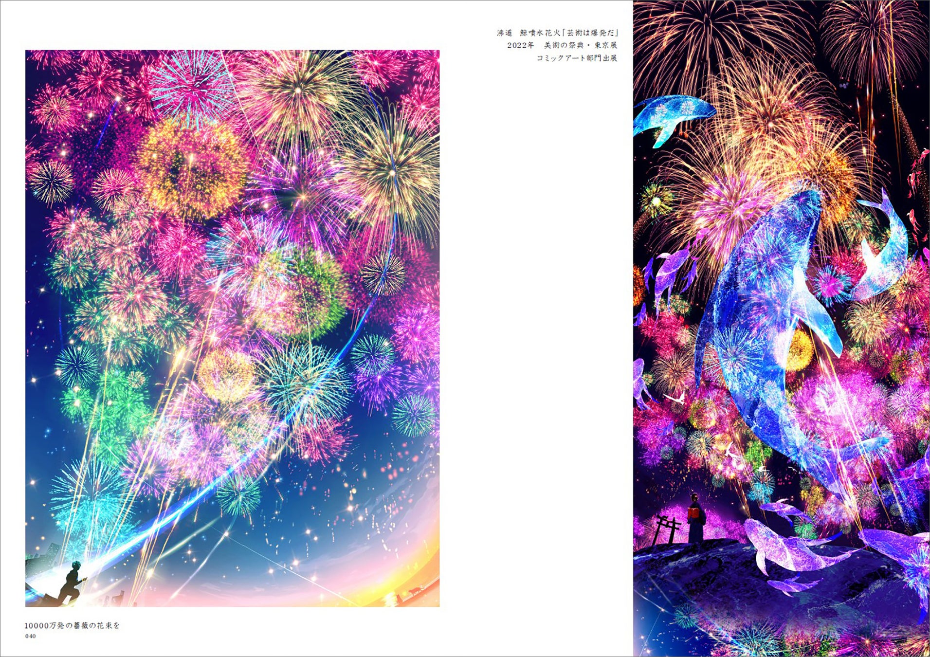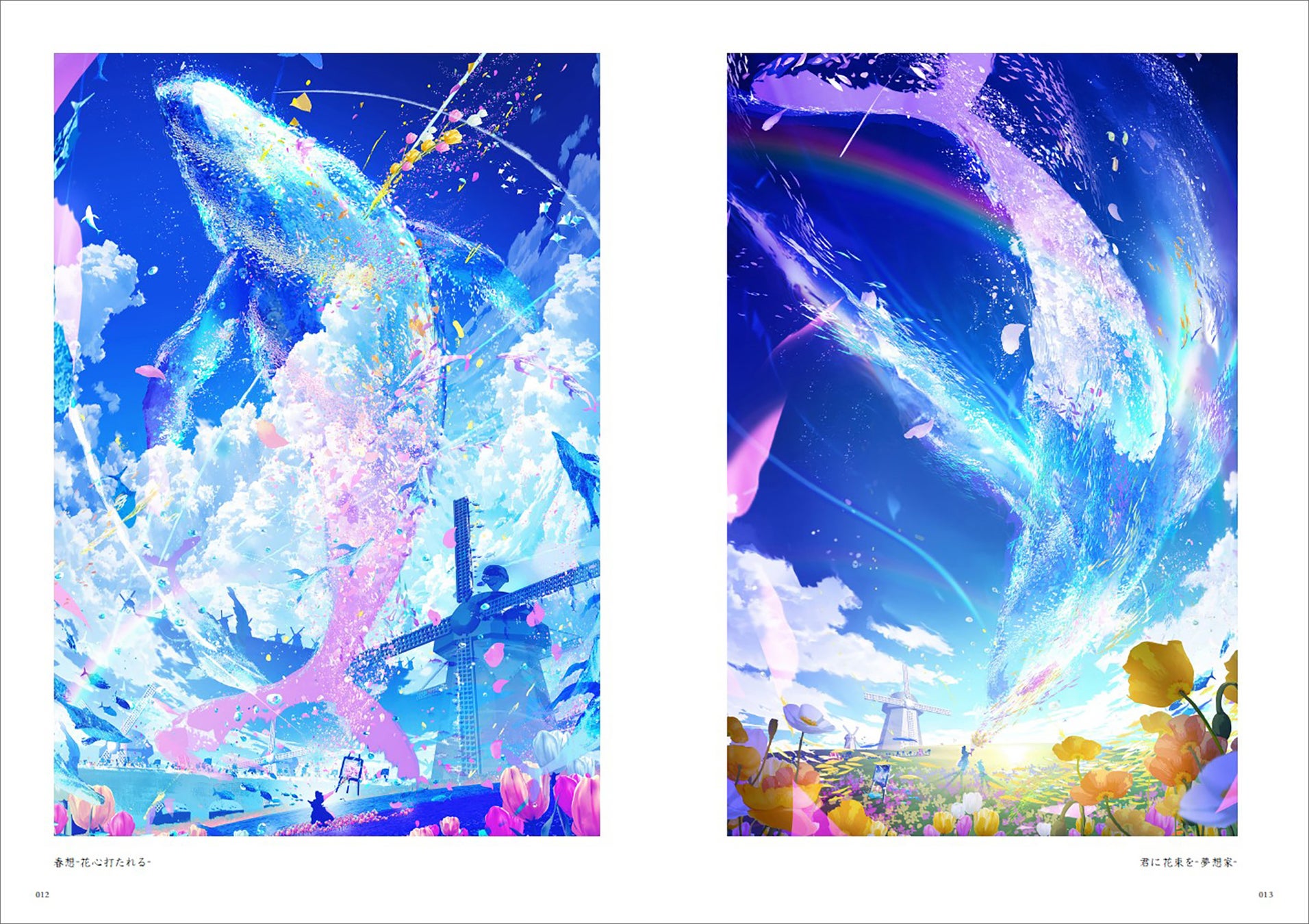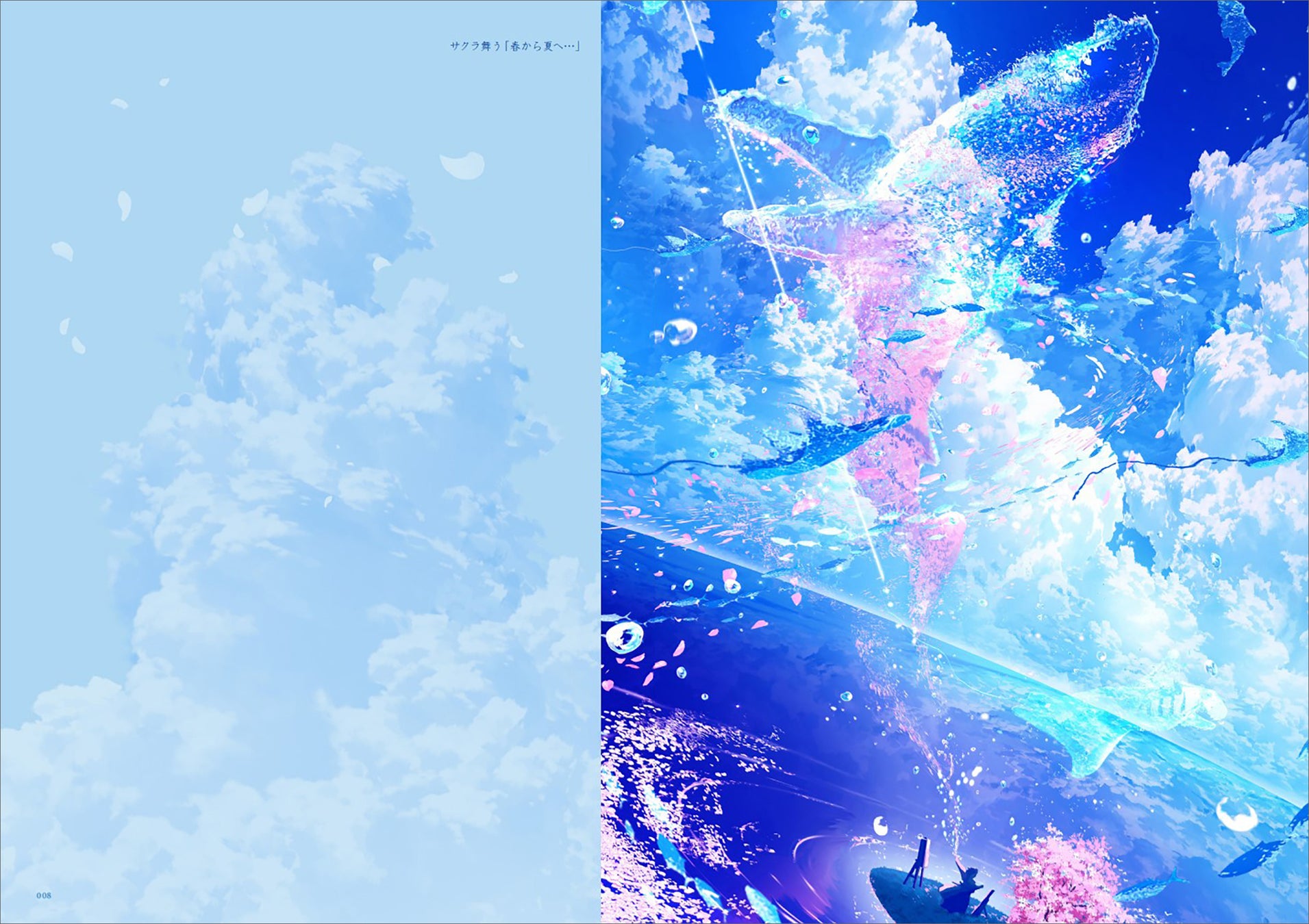 2023年8月7日に発売となる新刊『まころん画集 ソラノキオク』は、イラストレーター・風景画家まころん氏の初作品集です。青空、星空、夜空、夕焼け空、花火など、空をテーマにしており、透明感のある海洋生物が空を自由に回遊する幻想的なイラストの数々はTwitterやInstagramなどで発表されるたびに話題となっています。