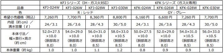 『サーモス デュラブルシリーズ マルチパン(KFJ/KFK シリーズ)』 仕様一覧