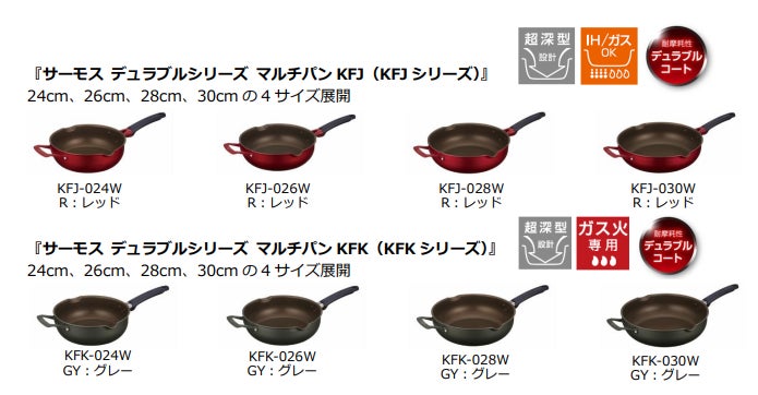 コーティングはサーモスのフライパンシリーズで人気の、耐摩耗性の高さと焦げ付きにくさが特長の「耐摩耗性デュラブルコート」を採用。IH・ガス火対応の『KFJシリーズ』と、ガス火専用の『KFKシリーズ』の2種類をご用意。サイズは、各24cm、26cm、28cm、30cmの4サイズを展開します。