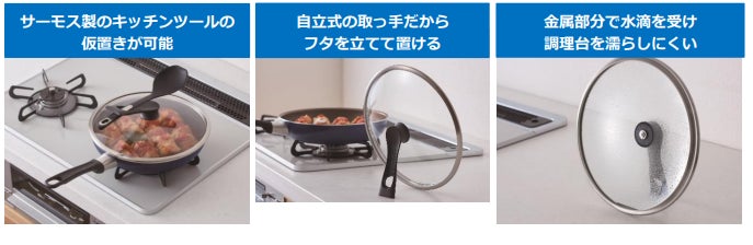 『サーモス スタンド式ガラスフタ(KLHシリーズ)』は、ガラス製で調理中の料理が見やすいフライパンフタです。サーモスのフライパンシリーズ各種にお使いいただけます(※3)。取っ手の部分には、サーモス製のキッチンツール(※4)を載せることができます。また自立式の取っ手で立てて置くことができ、さらにフタ内側についた水滴が調理台に落ちにくい仕様になっています。