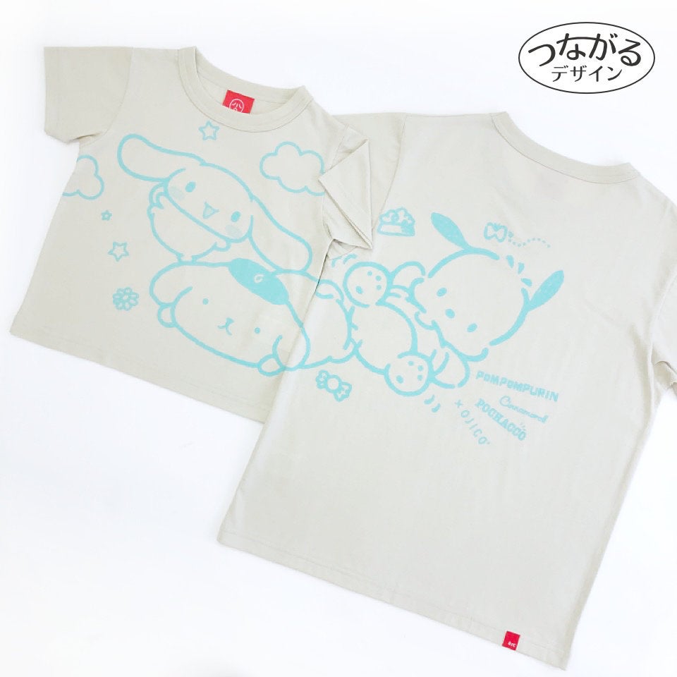 サンリオのイヌをモチーフにした3つのキャラクターが大集合!Tシャツのフロントとバックで繋がるデザインです。