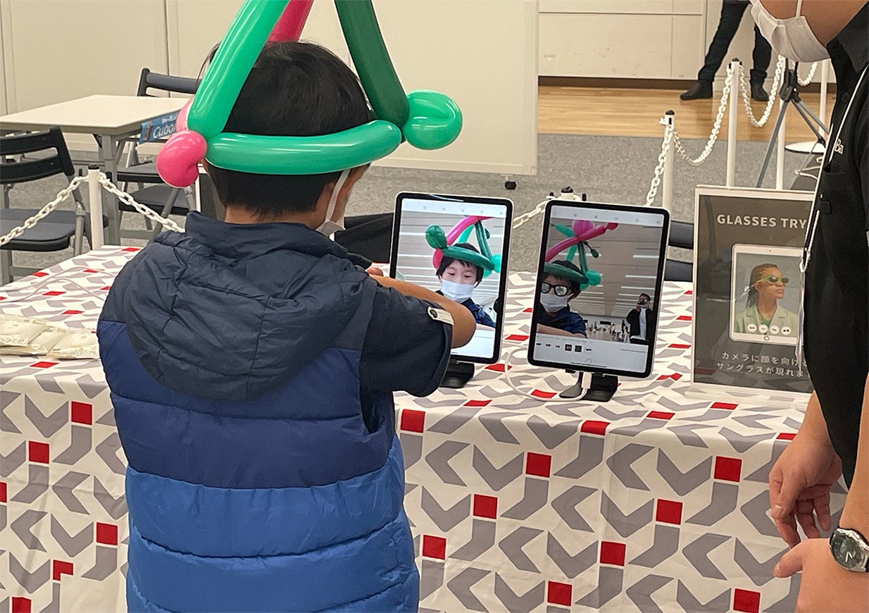 iPadのカメラを通して来場者の顔を検知し、3D画像化されたサングラスをフィットさせて表示することで、実際にサングラスを着けているかのような、バーチャルフィッティングを体験
