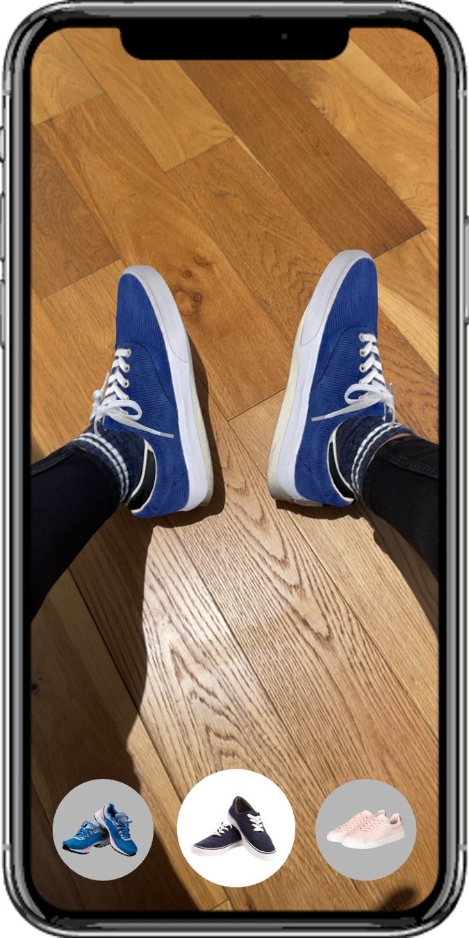スマートミラー(カメラ)を通して来場者の足を検知し、3D画像化されたシューズをフィットさせて表示することで、実際にシューズを履いているかのような、バーチャルフィッティングを体験