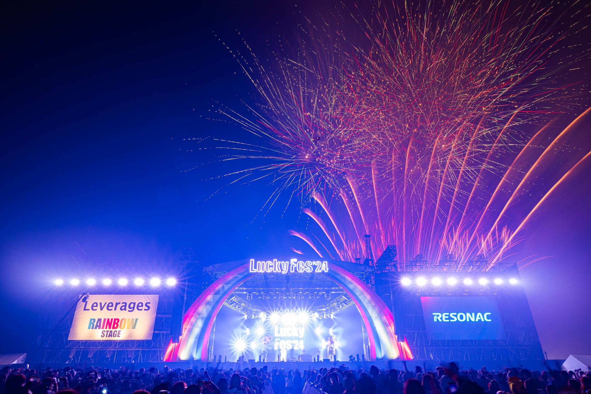 花火師には茨城県水戸市にて明治8年の創業以来、芸術性を重視した美しい花火を研究、製造する野村花火工業株式会社の野村陽⼀氏を4年連続で起用。野村花火オリジナルの時差式花火も登場します。そして企画プロデューサーのDJ DRAGONによるLuckyFesオリジナルのファイヤーワークストラックに合わせて、 花火が夏の夜空を彩ります。メインステージの「レバレジーズ presents RAINBOWSTAGE」後方から打ち上げる予定で、会場内では美しい花火をお近くで楽しむことができます。
