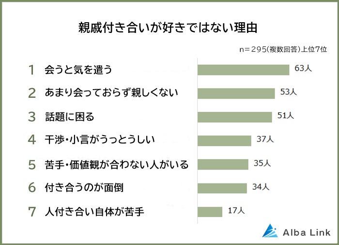 株式会社AlbaLink(本社:東京都江東区、代表取締役:河田 憲二)は、全国の男女500人を対象に「親戚付き合いに関する意識調査」を実施し、そのデータをランキングにしました。