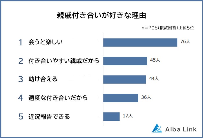 「親戚付き合いが好き」と答えた205人に好きな理由を聞きました。その結果、最も多かった回答は「会うと楽しい(76人)」でした。「楽しいから好き」は、とてもシンプルな理由ですね。