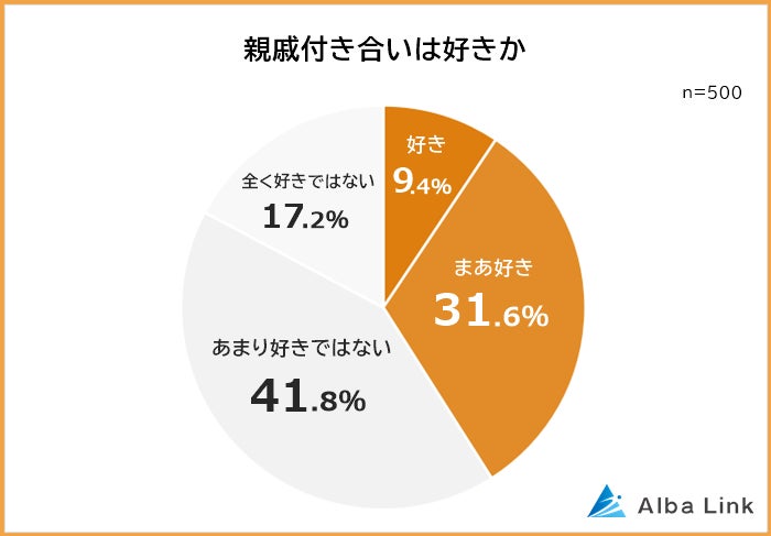 今回、株式会社AlbaLink( https://albalink.co.jp/)が運営する高く売る不動産( https://wakeari-hikaku.com/)は、全国の男女500人を対象に「親戚付き合い」についてアンケート調査を実施しました。