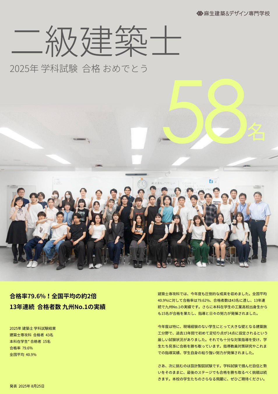 8月25日(月)に発表された令和7年度「二級建築士学科試験」で、福岡 麻生建築&デザイン専門学校は13年連続で合格者数 九州No.1を達成しました。