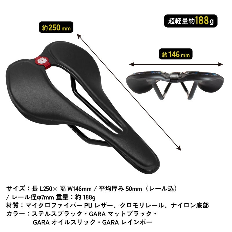 突出した個性を発揮できる、車体の軽量化に最適な超軽量サドルで、スタイリッシュですっきりした形状です。人間工学に基づいた適度なクッションと形状で、ロングライドでもお尻が痛くなりにくくなっています。