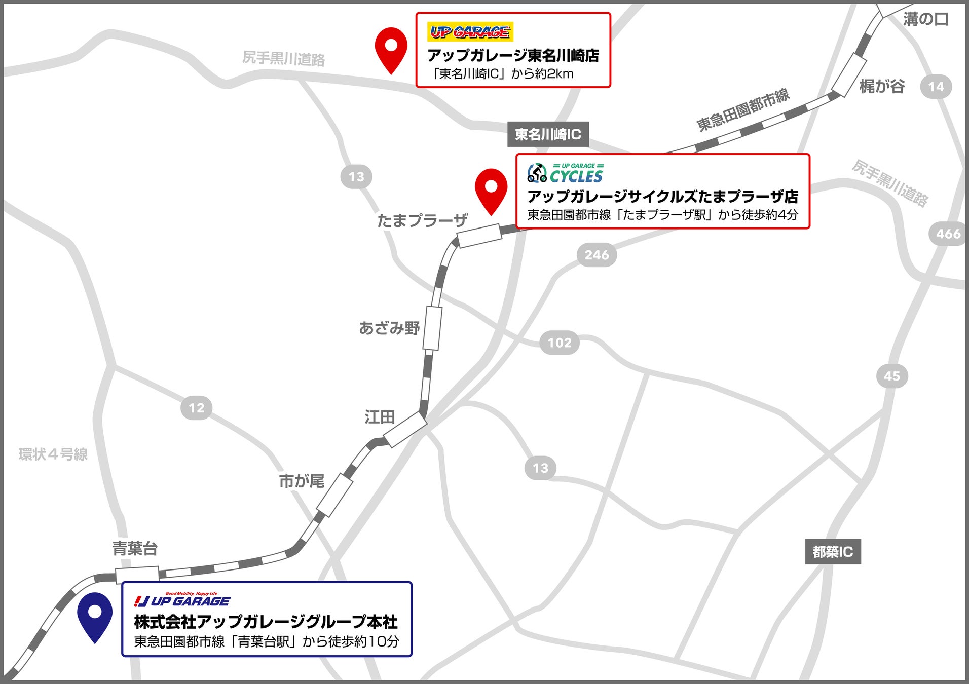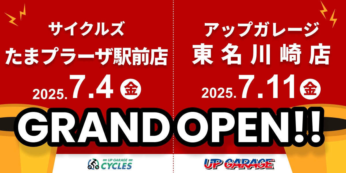 カー&バイク用品のリユース専門店「アップガレージ」を全国展開する株式会社アップガレージグループ(本社:神奈川県横浜市、代表取締役社長:河野映彦)は、2025年7月上旬に神奈川県横浜市青葉区および川崎市宮前区において、直営店の新店舗「アップガレージサイクルズたまプラーザ駅前店」と「アップガレージ東名川崎店」、併設店として「アップガレージライダース東名川崎店」「タイヤ流通センターアップガレージ東名川崎店」をオープンいたします。