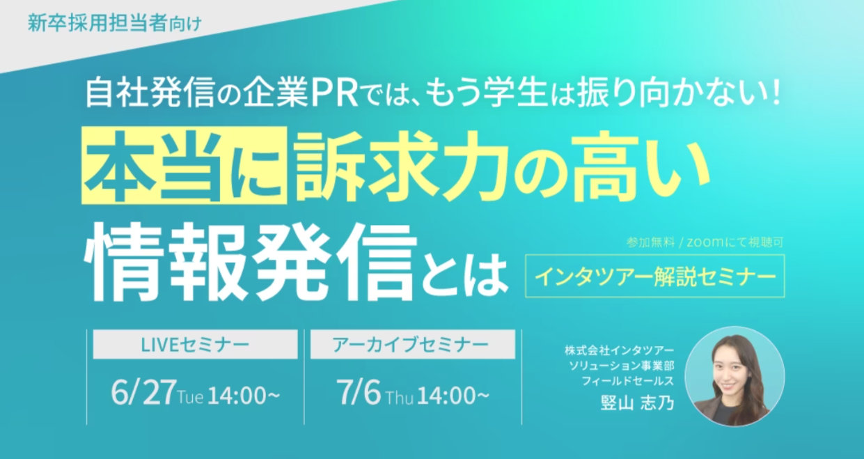 今回のセミナーでは、前半にZ世代の志向性をもとに採用活動において訴求力の高い情報発信の方法を読み解いていきます。学生の「道筋が見えること」を好む傾向を踏まえ、効果的な情報発信のポイントをお伝えします。後半では、弊社サービス「インタツアー」における情報発信の方法と、実際の活用例について解説します。