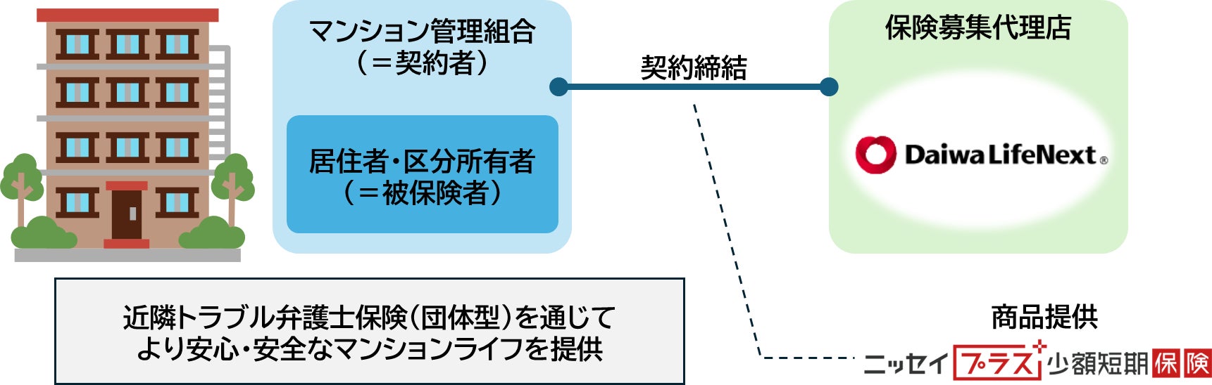大和ハウスグループの大和ライフネクスト株式会社(代表取締役社長:齋藤栄司、以下「大和ライフネクスト」)と、日本生命グループのニッセイプラス少額短期保険株式会社(代表取締役社長:光本正、以下「ニッセイプラス」)は、マンション管理組合向けに新商品「近隣トラブル弁護士保険(団体型)」を共同で開発し、2025年1月6日より順次ご案内を開始いたします。