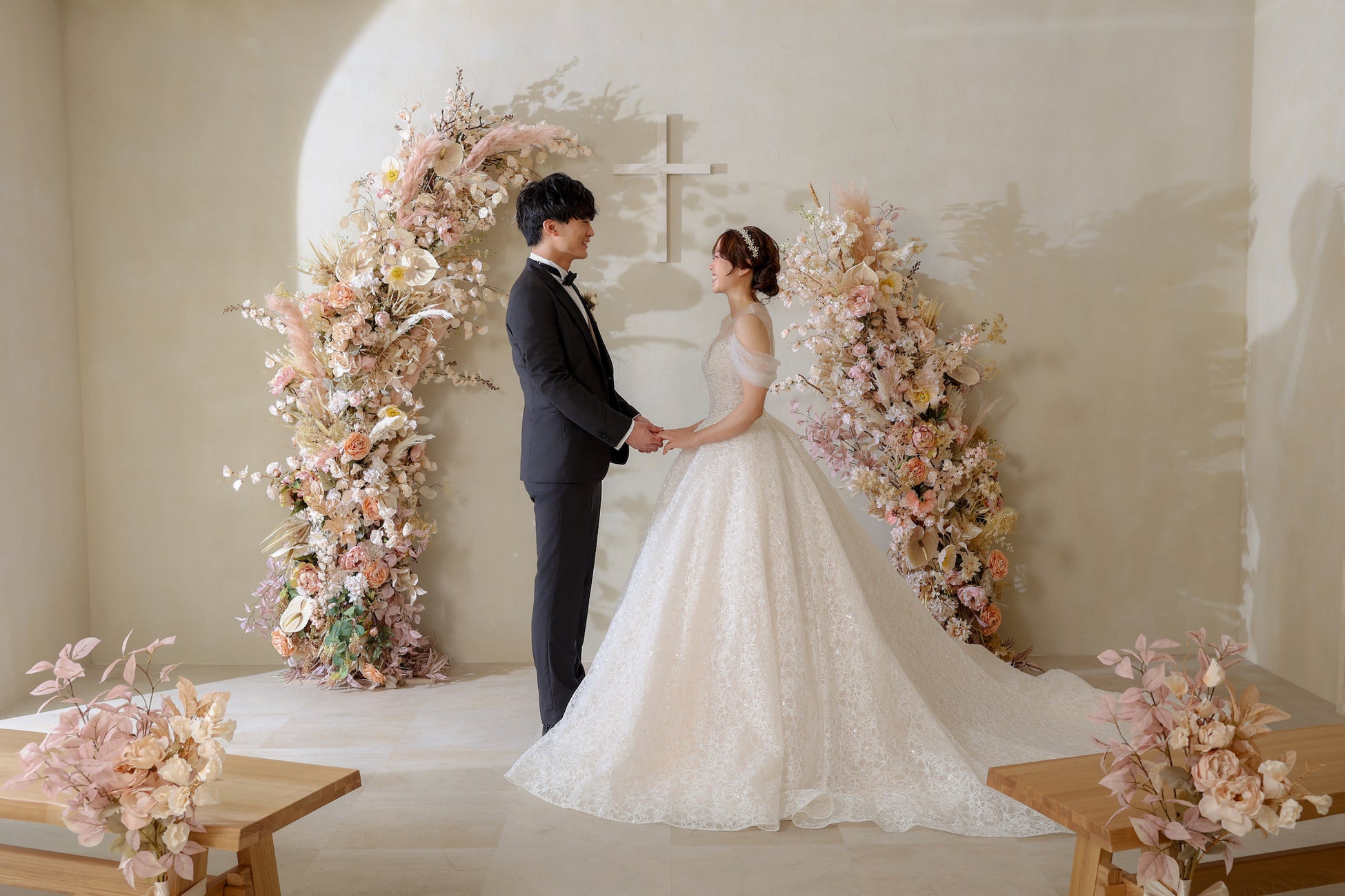 永遠の愛を誓うチャペル。ピンクベージュのフラワーアーチがおふたりの幸せを祝します。