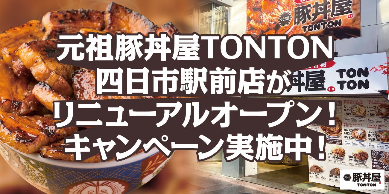 ワンズトライン株式会社(本社:大阪市北区芝田2丁目3番16号、代表取締役:山内仁)が運営する、北海道・帯広伝統の豚丼が人気の「元祖豚丼屋TONTON 四日市駅前店」(住所:三重県四日市市諏訪栄町1-8 2F、TEL:059-340-5050)が、'23年10月10日(火)リニューアルオープンいたします。