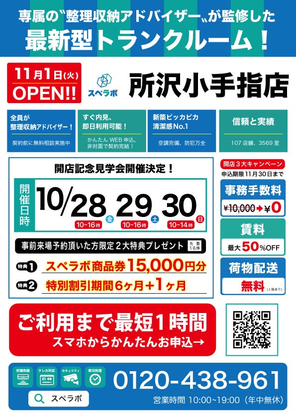 【11月1日(火)オープン】見学から契約、解約まで完全非接触・非対面、お申し込みからご利用まで最短1時間!絶賛運営中のトランクルーム【スペラボ】が埼玉県所沢市小手指に出店!