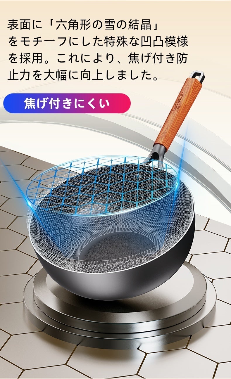 ✓均一な熱伝導:雪の結晶のような幾何学模様が熱の拡散を促進して、局所的な過熱を防ぎ、油の使用量を抑えたヘルシー調理が可能です。