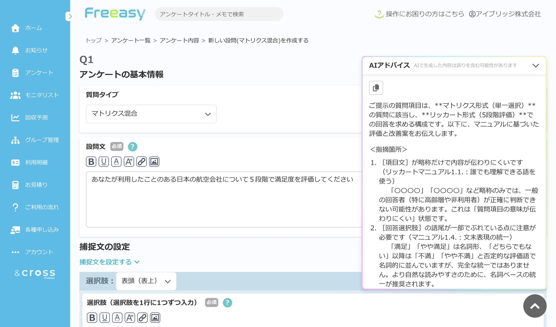 年間3万件以上の調査実績を誇る、国内最大級のセルフ型アンケートツール「Freeasy(フリージー)」を展開するアイブリッジ株式会社(本社:大阪市福島区、代表取締役社長:荒川和也)は、セルフ型アンケートツール「Freeasy」において、筑波大学との共同研究から生まれた新機能「AIアドバイス」β版をリリースしたことをお知らせします。