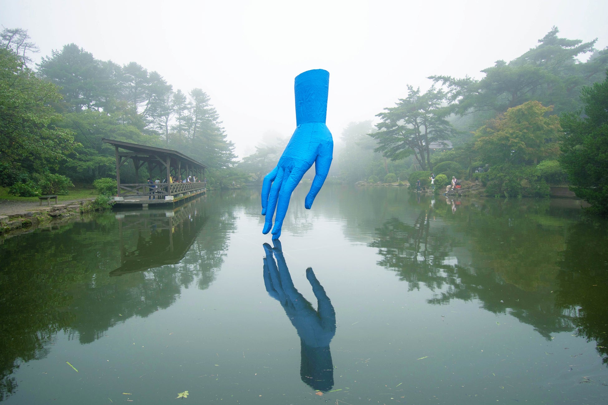 弥勒菩薩やヌト神、赤子の手を参考にした造形にブルーシートを纏わせた、高さ約4mの作品、久保寛子による《やさしい手》が心字池に浮かび上がります。また、久保による全長約20mの巨大な彫像《ハイヌウェレの彫像》は、展示準備期間中にワークショップを実施し、参加者とともにつくりあげる作品となっています。
