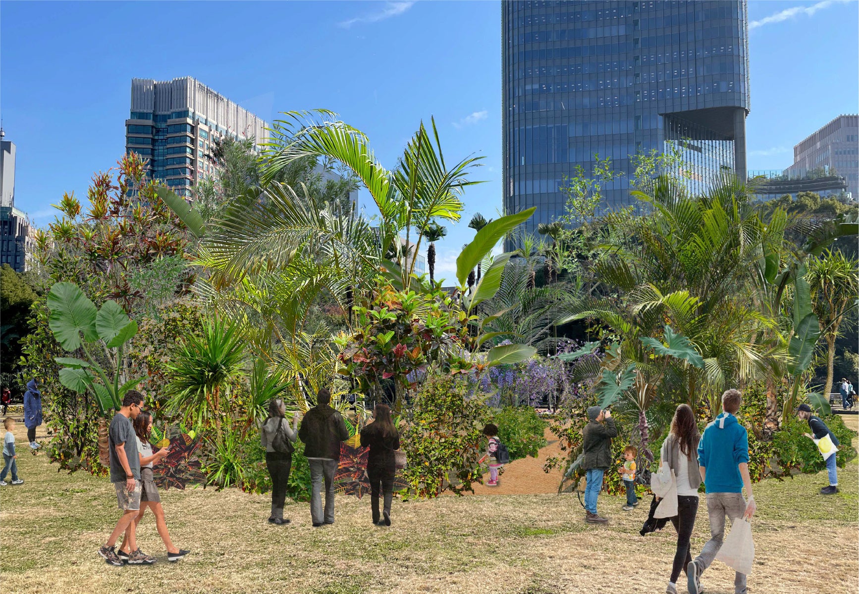 第一花壇のシュロを中心とした直径約28mの空間に、さまざまな種を織り交ぜた植栽によるジャングルをつくり、普段とは異なる自然の生態系の姿を浮かび上がらせます。