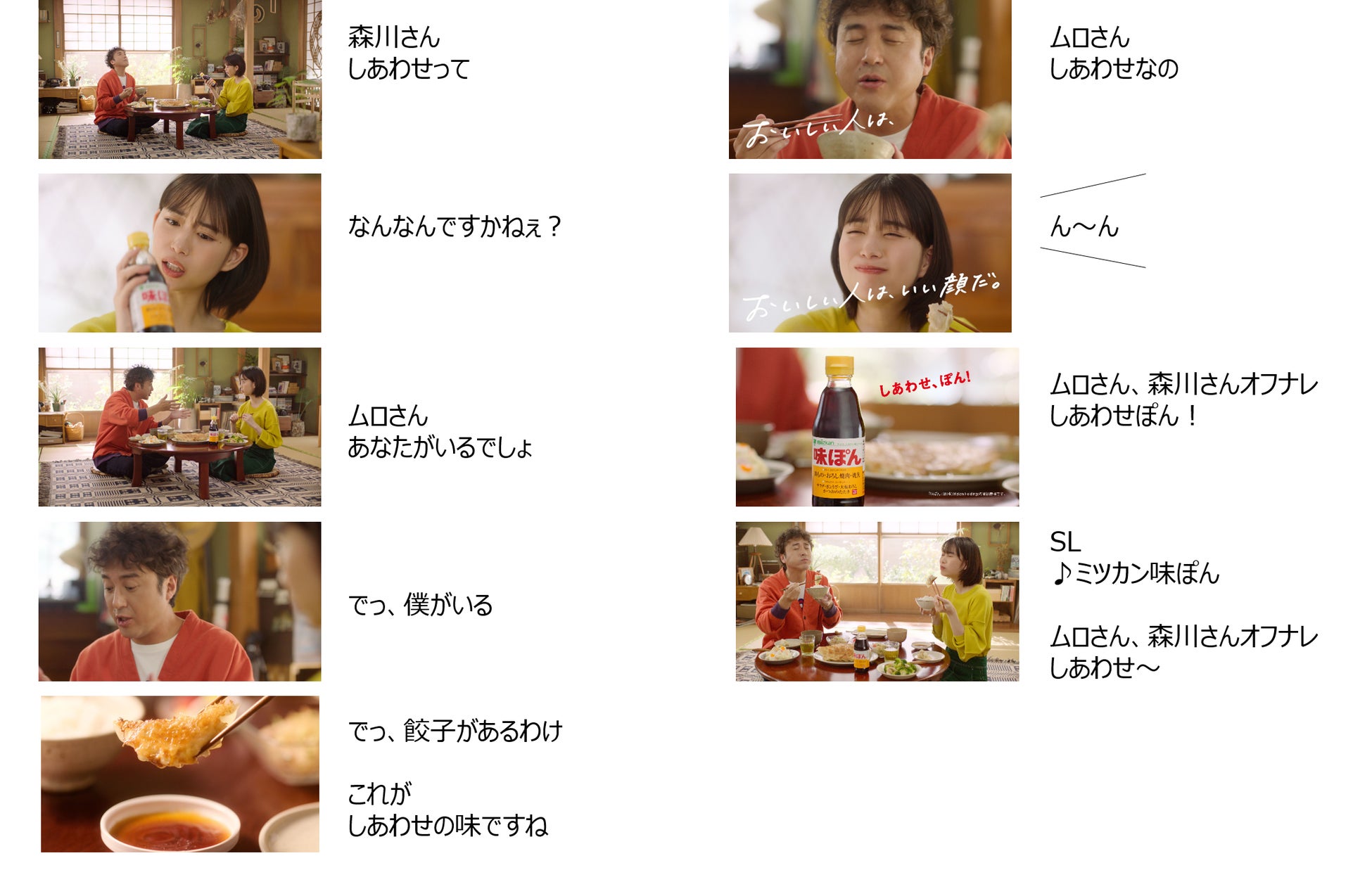 ムロさんに招待された森川さんが、食卓で自慢の「ぽん餃子」を振る舞われる中で、「しあわせってなんなんですかねぇ?」と質問します。それに対して、「あなたがいるでしょ」「でっ、僕がいる」と森川さんと自分に交互に手を向けた後、「で、餃子があるわけ」と味ぽんをたっぷりつけた熱々の餃子を頬張るムロさん。身近なところを例にして、諭すように自分自身が考えるしあわせを語ります。その言葉に納得した森川さんも「これがしあわせの味ですねぇ」と餃子をパクリ。「しあわせなの」というムロさんと森川さんは、しあわせたっぷりの表情で「ぽん餃子」のおいしさを噛みしめます。
