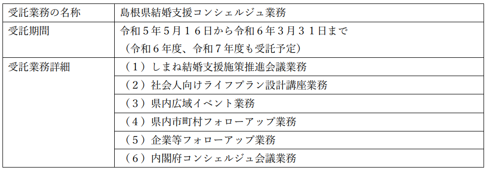 受託業務の名称 | 島根県結婚支援コンシェルジュ業務 |