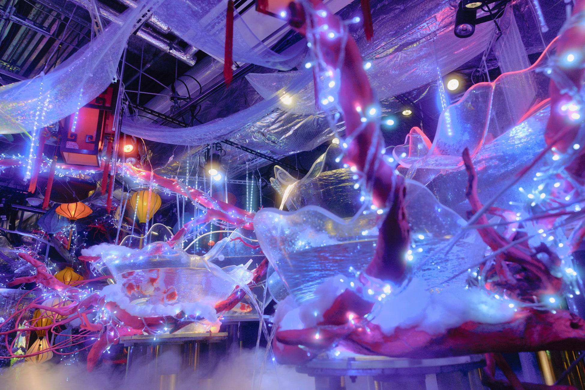 本展示は、“冬の夜空に浮かぶ天の川”をテーマにした冬季限定展示です。雪や氷柱(つらら)、白と青の柔らかな光を組み合わせ、入口からメインエリアまで館内全体を冬の銀河空間として演出します。白を基調とした金魚が光の帯のなかを泳ぐ姿に、冬の花材やオーナメントを添えることで、静けさと美しさを併せ持つ幻想的な水中景観を表現。寒い季節ならではのアクアリウムをお楽しみいただけます。