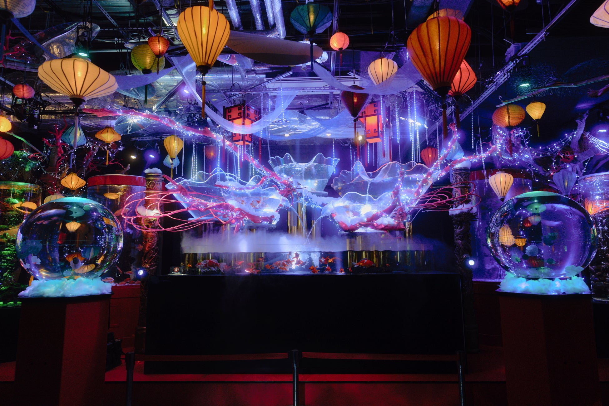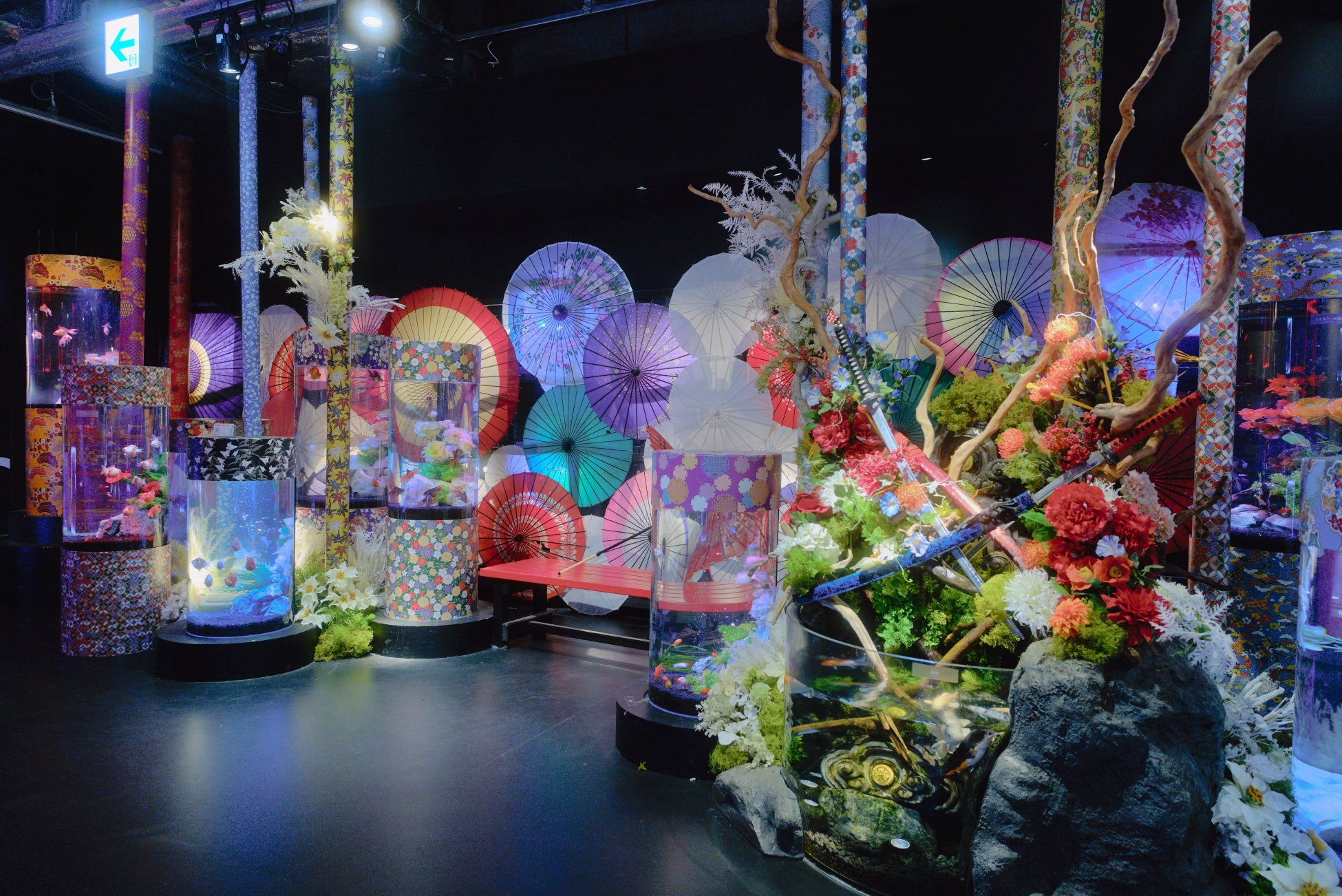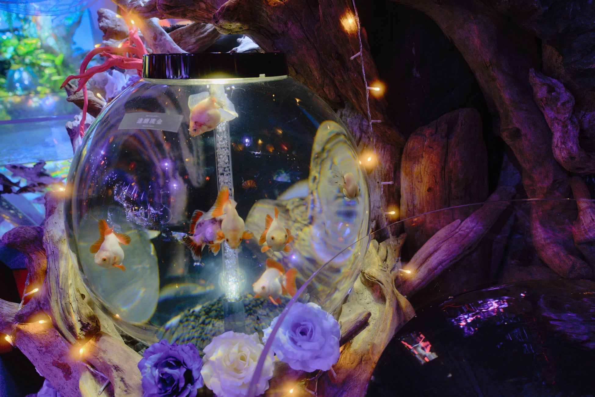 流木アートとオーロラのような光が銀河を思わせる空間をつくり、来場者はその中を歩いているかのような没入感を体験できます。白と青の光が重なり合う水槽では、白い金魚たちが光の筋を横切るように泳ぎ、漂う星々を間近で覗き込んでいるような感覚を味わっていただけます。
