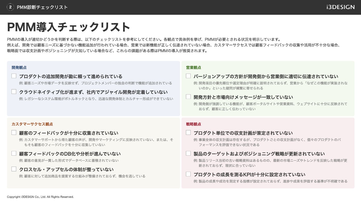 その結果、私たちは企業がPMMフレームワークをよりスムーズに導入し、最大限の効果を得られるよう支援するための「チェックリスト」を公開することを決定しました。このチェックリストは、開発と営業の連携強化や、プロジェクトの成功を加速させるために必要な手順や注意点を網羅しており、実際の導入プロセスを確実にサポートします。