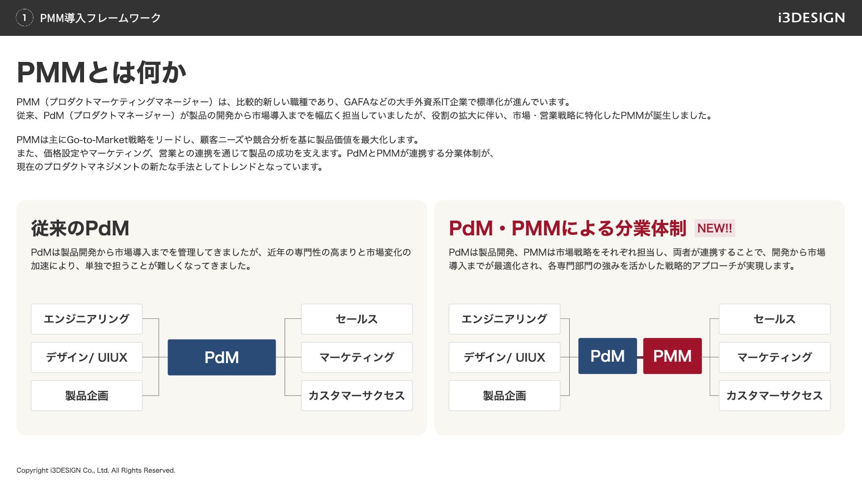 株式会社アイスリーデザイン(本社:東京都港区、代表取締役:芝陽一郎、以下:当社)は、2024年11月27日に業界初(*)のPMM(**)フレームワークと診断チェックリストを公開しました。PMMはGAFAなどの大手外資系IT企業で標準化が進んでおり、製品価値を最大化するプロダクトマネジメント手法です。