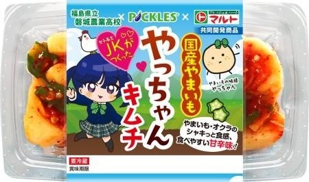 (2) 商品特徴:福島県⽴磐城農業高校生活科学科2年生が、ご飯がススムキムチで有名な漬物・キムチメーカーの株式会社ピックルスコーポレーション様とマルトと共に、漬物の未来、将来性を考えながら商品開発を致しました。様々な漬物の種類、食材を検討した結果、食べやすい食感で漬物材料としては少ない山芋をキムチする事になりました。味付けも試作を重ね、甘辛く大人から子供まで美味しく食べられるように仕上げました。商品名は主食材の国産やまいもを可愛らしく表現するため、山芋の妖精やっちゃんと名付け、女子高校生10名が開発した事から、”JKがつくった やっちゃんキムチ”という商品名になりました。いわき市産の食材としては、キムチの素であるヤンニョムの長ネギになります。