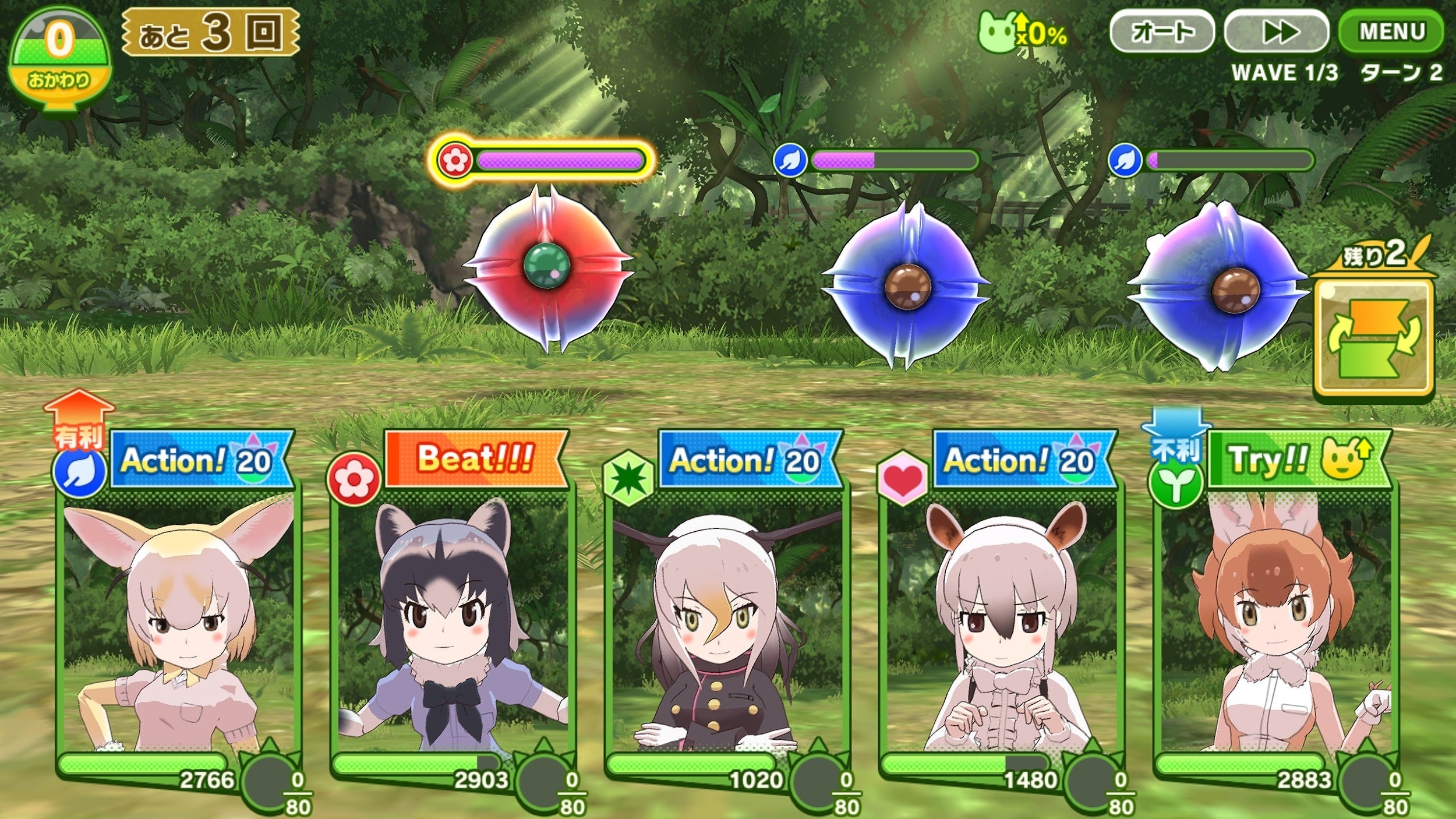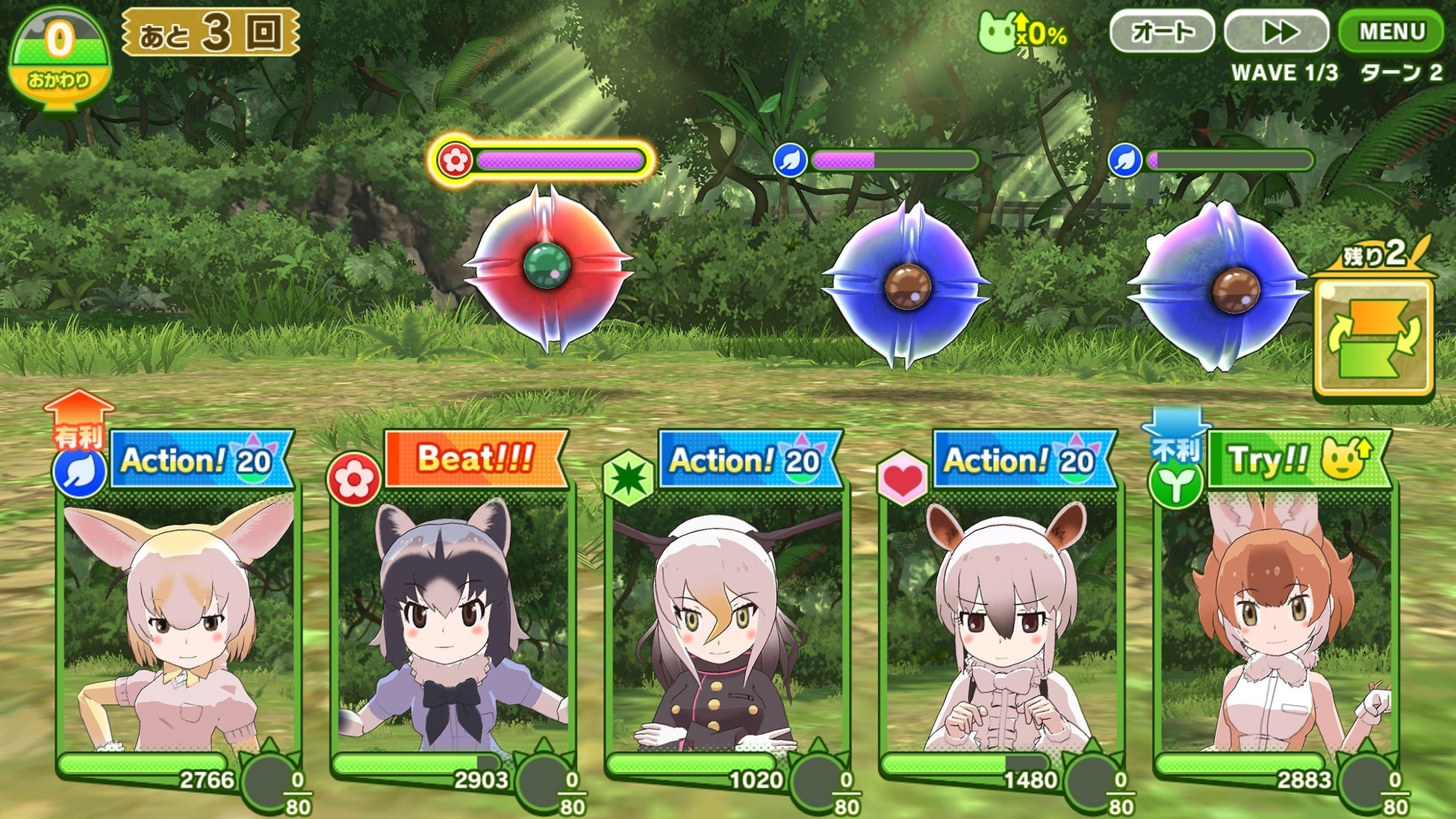あなただけの「オーダーフラッグ」を組み合わせて、フラッグの効果がアップする「けもコーラス」や、フレンズひとりひとりの大技「けものミラクル」でやっつけよう!