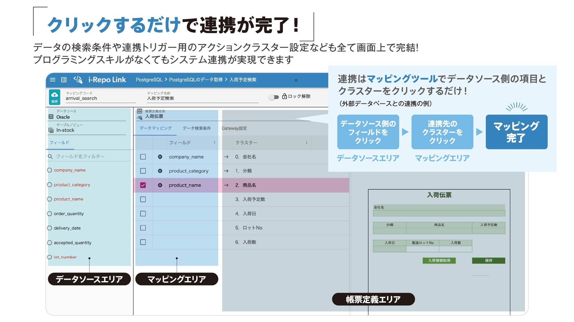 データソース側(Oracleデータベース)のフィールド、i-Reporterのクラスターが画面内に表示されるので、クリックでつなぎ合わせてあげるだけでシステム連携が実現します。