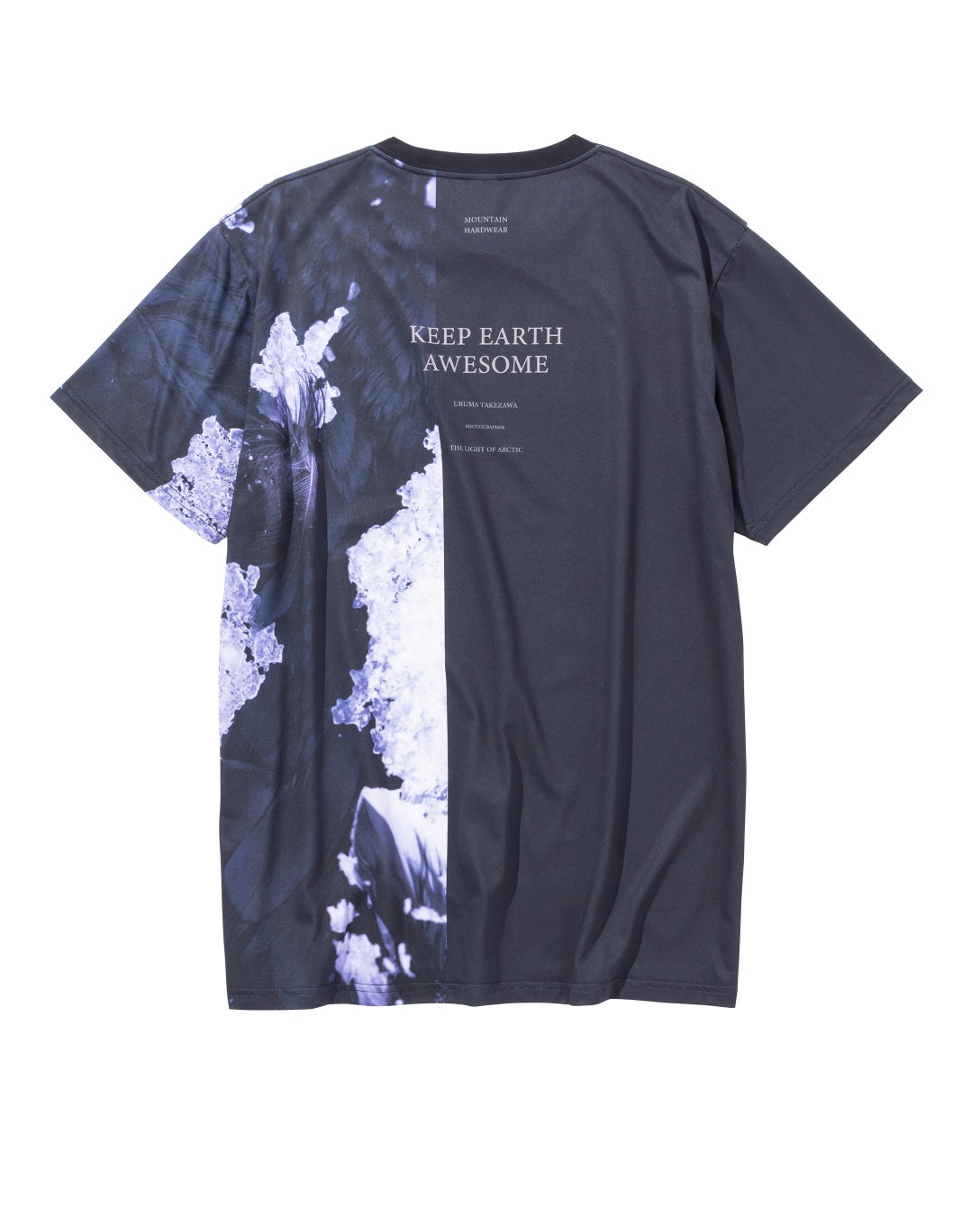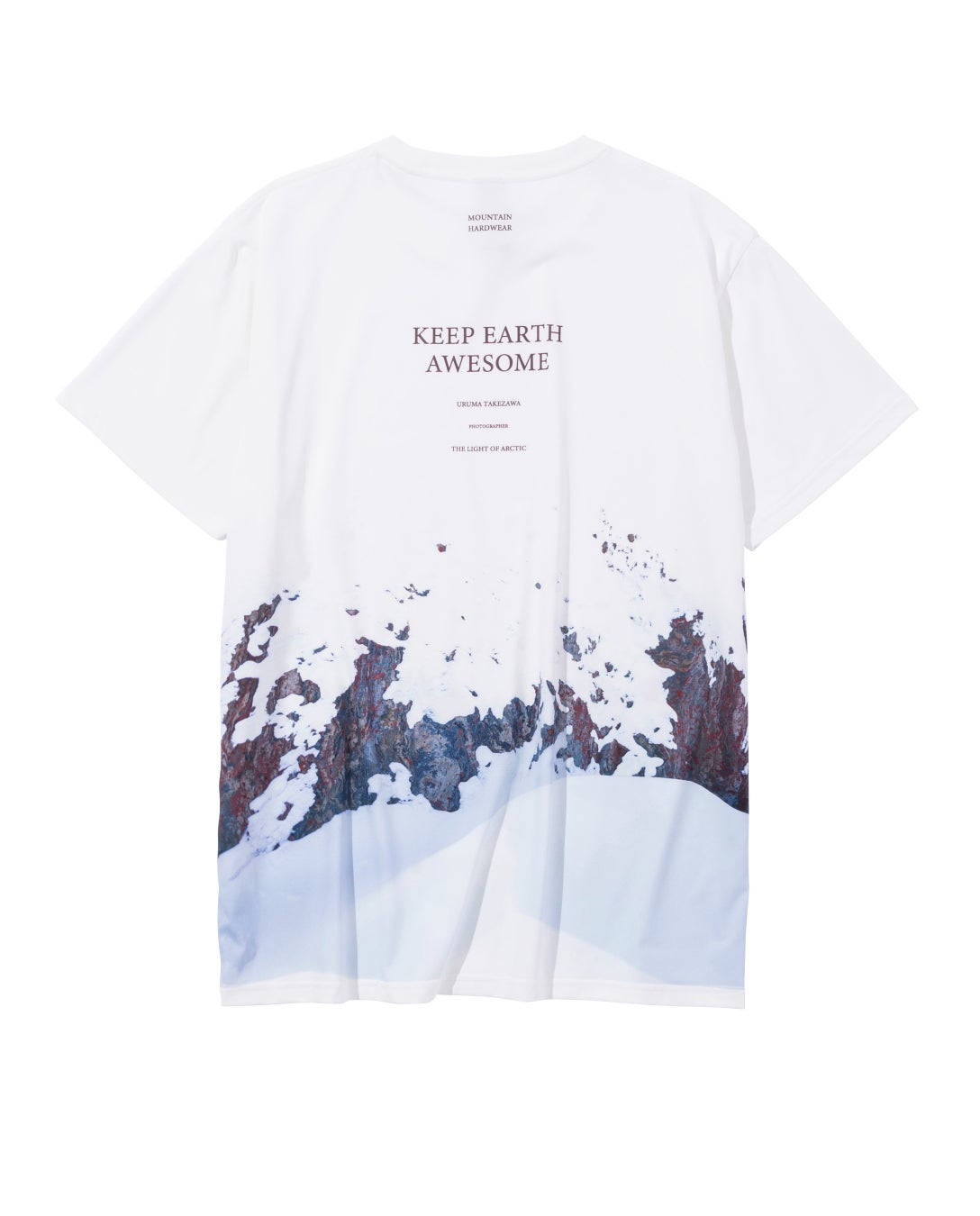 3種類のTシャツはそれぞれ、極寒の地で黒鳥の羽の上にできた白い薄氷、極地の真冬の岩壁、夕焼けのカナック沖の氷山の写真をデザインに落とし込んでおり、北極の様々な光を感じることのできるカラー展開です。背中には「KEEP EARTH AWESOME」とプリントされており、素材はリサイクルポリエステル100%のコットンライクなしなやかな着心地に仕上げました。