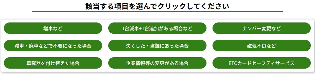 今までは、「車両が変更になったらどう手続きするのか」「新しく追加した車両があるがどうしたらいいか」等、毎度電話にて確認を行う方法しかなく少し手間でお困りだった企業様に向けて【ワンクリック】で簡単にどの申請用紙が必要なのかが明確に!