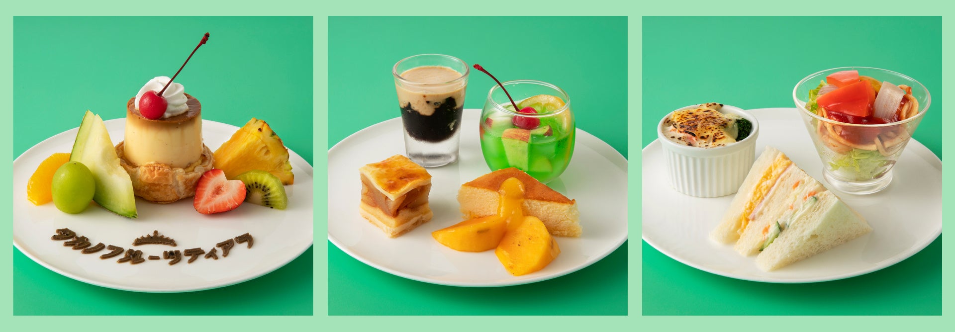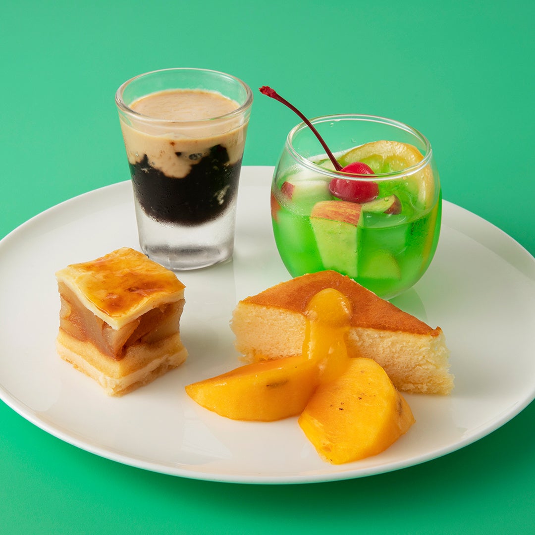 メロンソーダフルーツポンチ/コーヒーゼリー 黒糖クリームがけ/ベイクドスフレチーズケーキ~柿ソース~/アップルパイ