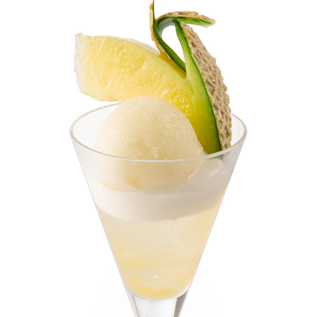 メロンの芳醇な香りを感じる店内製造シャーベットと、メロンソース、コアントローゼリー、ディプロマットクリームを重ねたパフェです。